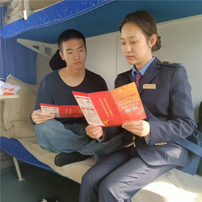 (宝鸡讯 柏江报道 通讯员夏雨)由西安客运段宝鸡二队烟台四组值乘的K1132次列车,乘务员手持“2025年全国消防宣传月”宣传手册,与旅客面对面讲解消防安全知识,从防火要点到逃生技巧,细致入微。