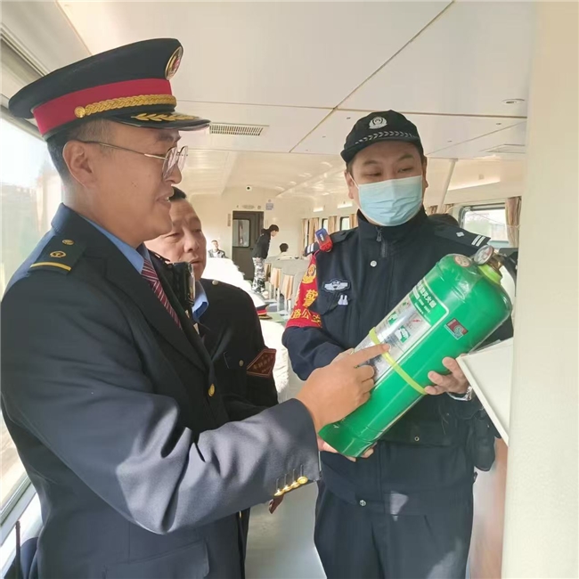 列车工作人员与铁路公安一同仔细检查消防设施,确保灭火器状态完好,把好安全设备关。