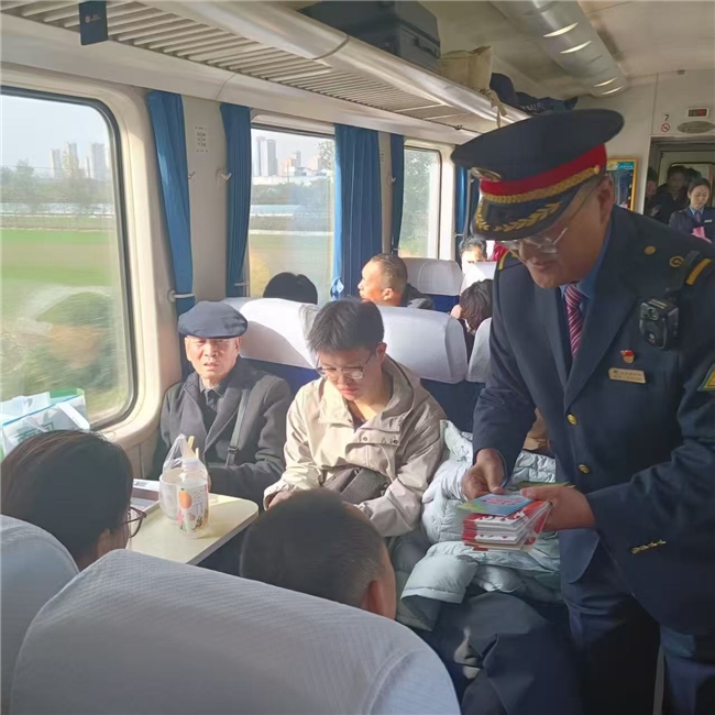 乘务员穿梭在车厢中,向旅客发放消防宣传资料,将安全知识送到每一位旅客手中。