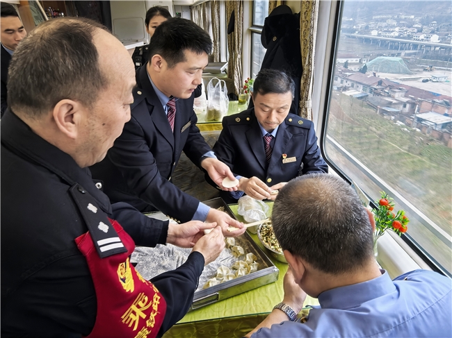 当晨光初破晓,由西安客运段安康一队汉京四组担当的K262次列车,正稳稳地行驶在铁轨之上。在列车长张涛的精心组织下,餐车内一片热闹景象,铁路职工们正忙着包饺子,迎接冬至的到来。一张张饺子皮在灵巧的手指间翻飞,不一会儿,案板上便摆满了各式各样的饺子:有传统的月牙形,也有创新的金元宝状,欢声笑语充满了整个车厢。