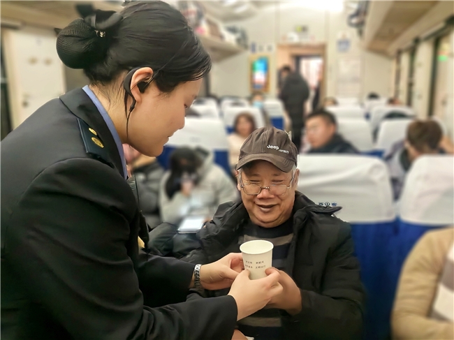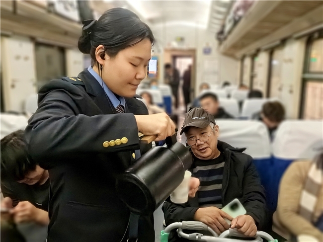 20:20,列车长张秋艳在站台看到这位特殊重点旅客后,立即协调岗位安排靠近车厢门的宽敞位置,方便轮椅停放,上车后,乘务员小李主动为他们送水热水,并细心地说:“暖暖手再喝吧,今天的风可冻呢!”“我父亲腿脚不便,这一路多亏了工作人员。”儿子赵先生感激地说,“每次停车,都有乘务员提前来问要不要帮忙,尤其是你们车上给我预约这个重点旅客协助服务真是太贴心了,感谢一路照顾,咱们有缘再见。”