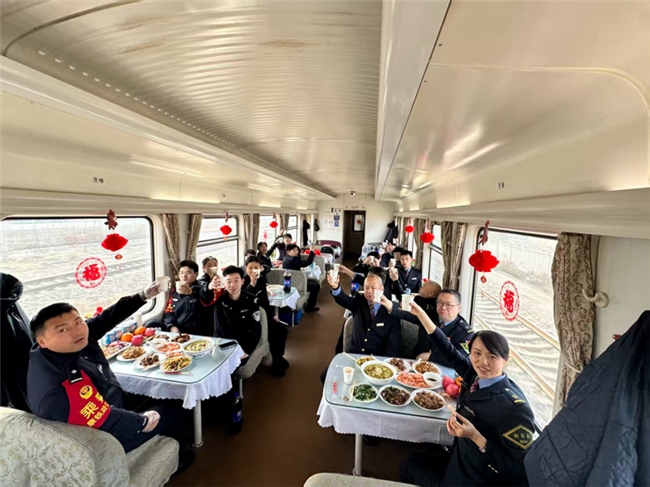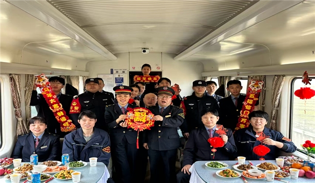 最后一班春运,她选择站好最后一班岗。除夕当天,K262次列车的餐车车厢被年味装点得格外温馨。车窗上贴着红彤彤的福字,车厢连接处挂着喜庆的拉花,屈红和班组的同事们身着笔挺的制服,围坐在摆满家常菜的桌前,有人举着“五福临门”的吉祥挂饰,有人捧着大红的福字,大家脸上洋溢着温暖的笑容,齐声送上新春祝福。